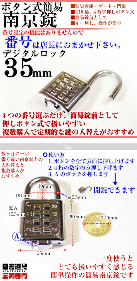 メール便 で2個以上 送料無料 ※番号指定なし ボタン式 簡易 南京錠 35mm 4番号70通り 8ボタン デジタルロック キー 無し 使いやすい マンション 会社 共用部分侵入防止用 森林ゲート ゴミ置き場 屋外門扉 に!